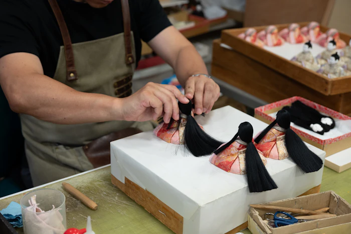 そのルーツは、元文年間(1736~41年 )の京都・上賀茂神社にあります。祭り道具の木っ端を彫刻して、祭りの衣裳着の端切れを着せつけた人形が加茂人形として愛されていました。それが江戸に流れ、桐塑を型抜きして量産できる製造方法に変化したのが、江戸木目込人形です。