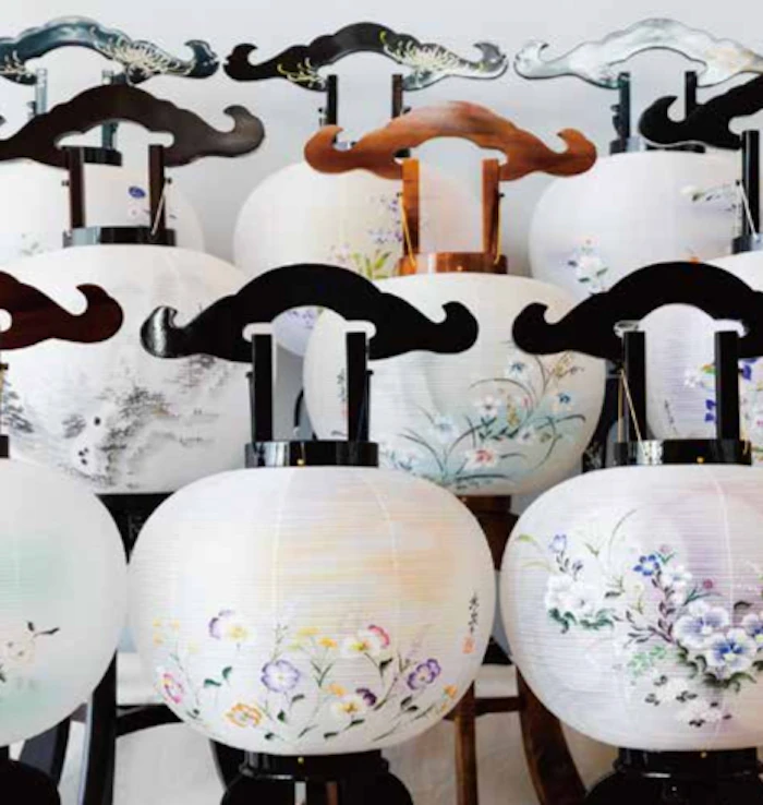 八女提灯の起源は江戸時代にさかのぼる。竹を螺旋状に巻いて骨をつくり、和紙を張り、そこに絵を描く。内部の光が透 けることで、絵はわずかに陰影を帯び、立体的に浮かび上がる。